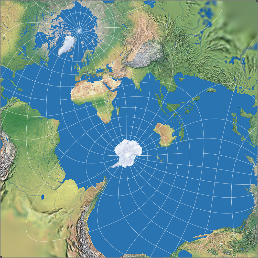 ![]() Spilhaus-Adams Projektionsgrafik von Tobias Jung ist lizenziert unter einer Creative Commons Namensnennung - Weitergabe unter gleichen Bedingungen 4.0 International Lizenz. Grafik basiert auf Natural Earth II by Tom Patterson mit verdunkelten Farben. |